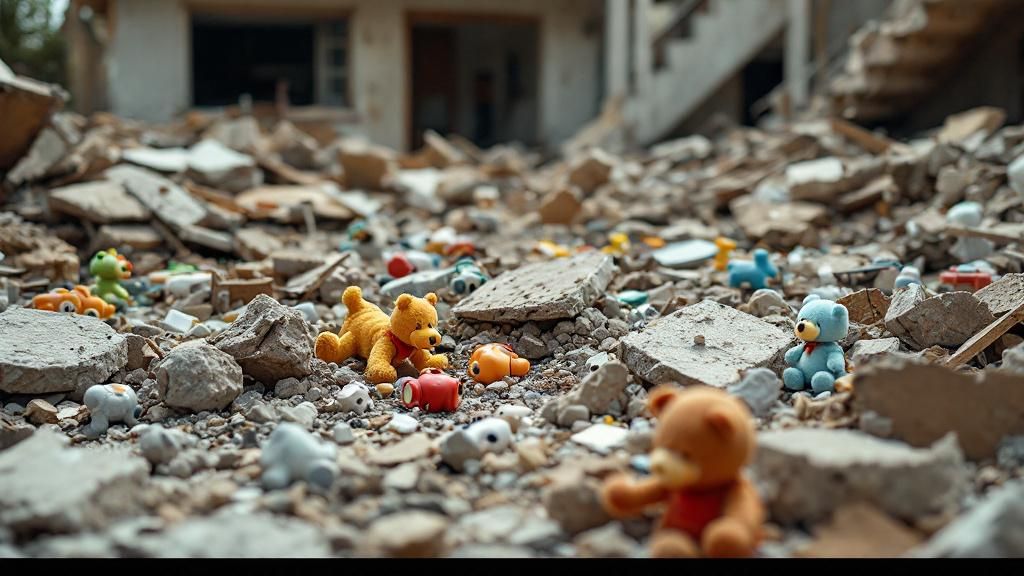 • Toys belonging to children and domestic goods discovered scattered in rubble